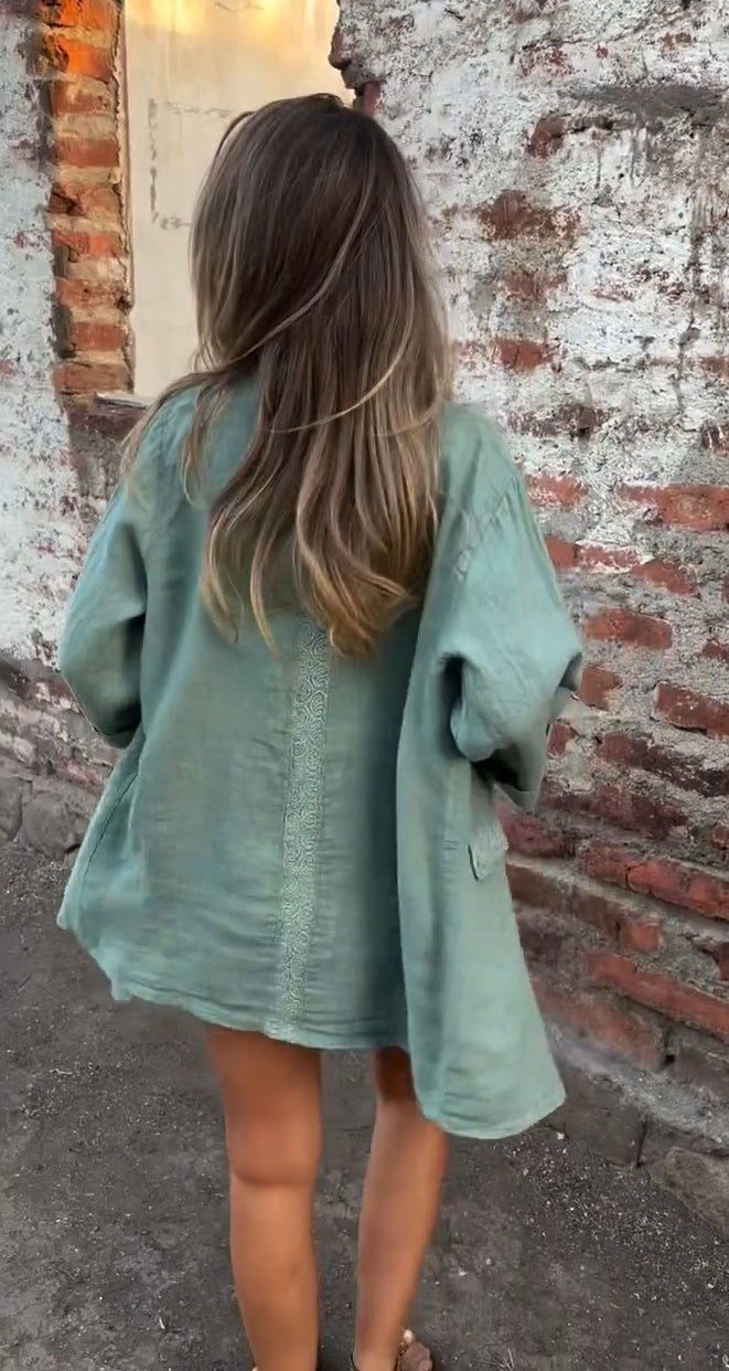 Atmungsaktives Leinen-Baumwoll-Gemisch: Diese Jacke aus einer hochwertigen Leinen-Baumwoll-Mischung ist leicht, atmungsaktiv und perfekt für ein angenehmes Tragegefühl bei warmem Wetter.